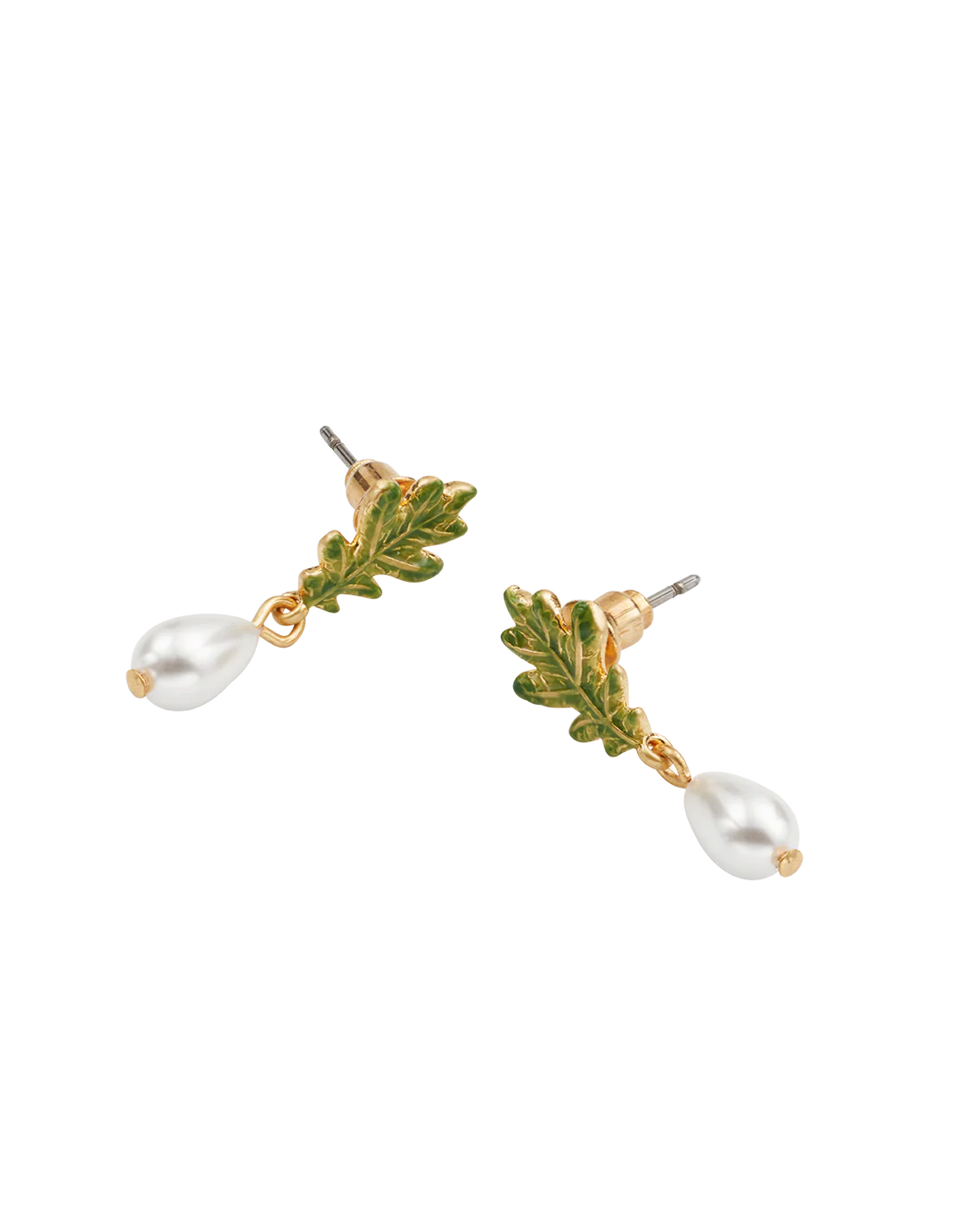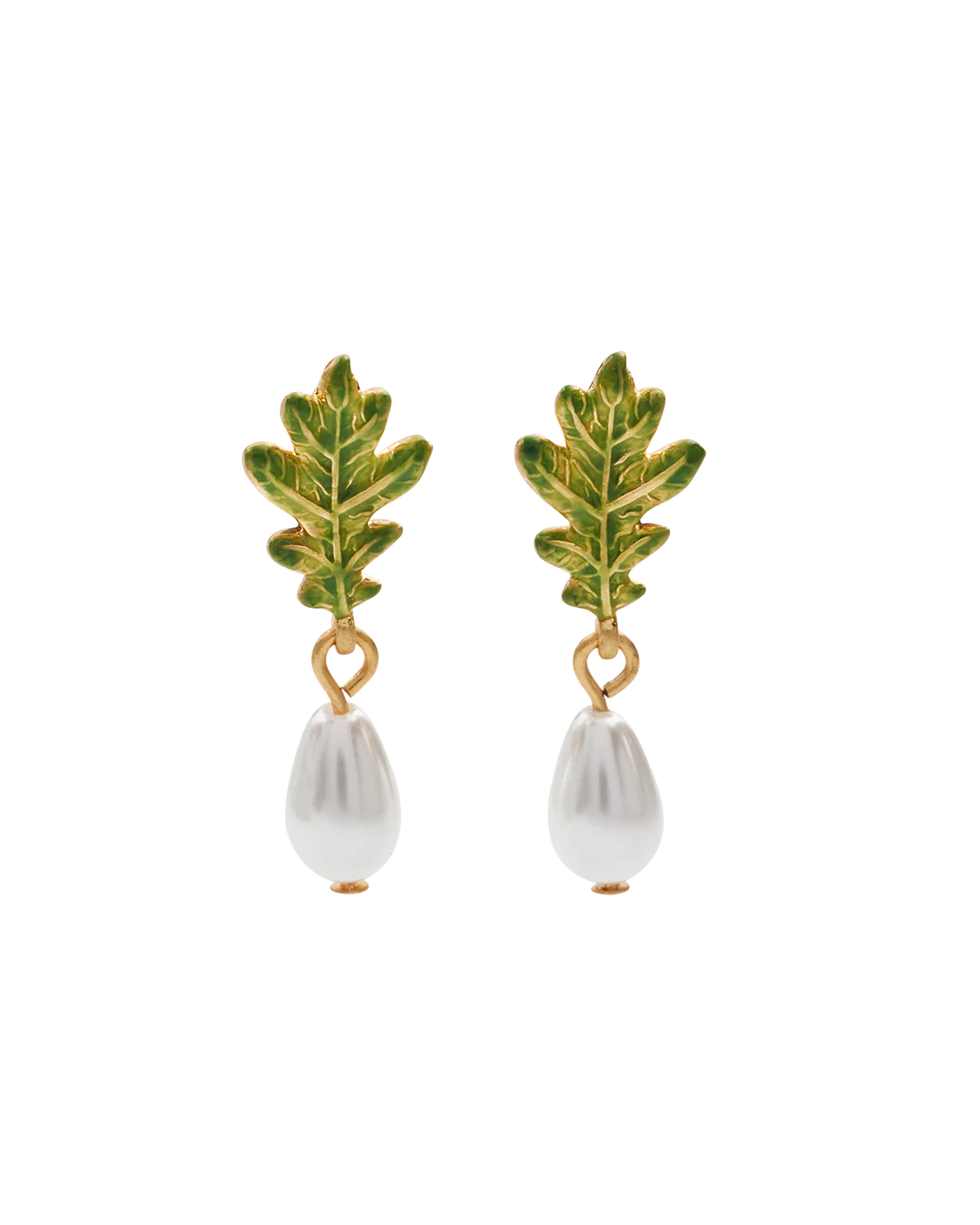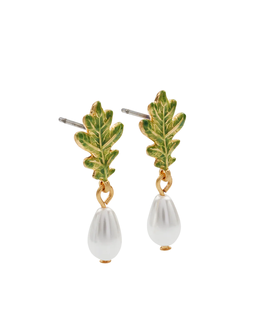 • Detail: Earrings featuring delicate hand-painted enamel oak leaf drops paired with a single faux pearl.