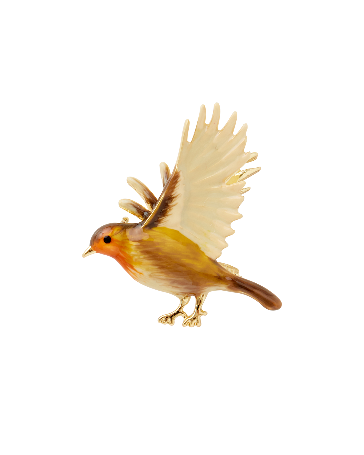 • Detail: Brooch featuring a delicate hand-painted enamel flying robin design.